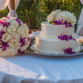 2 tier wedding cake with white flower bouquet on table